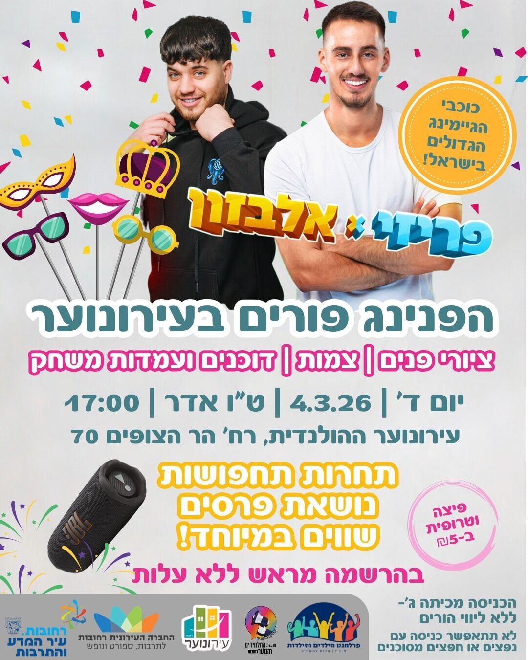 ביום רביעי, ה-4.3.26, החל מהשעה 17:00, ייערך הפנינג פורים עם פריזי ואלבזון. האירוע יתקיים בעירונוער ההולנדית, ברחוב הר הצופים 70. הכניסה לאירוע ללא עלות, אך מותנית בהרשמה מראש עקב הגבלת מספר המקומות.