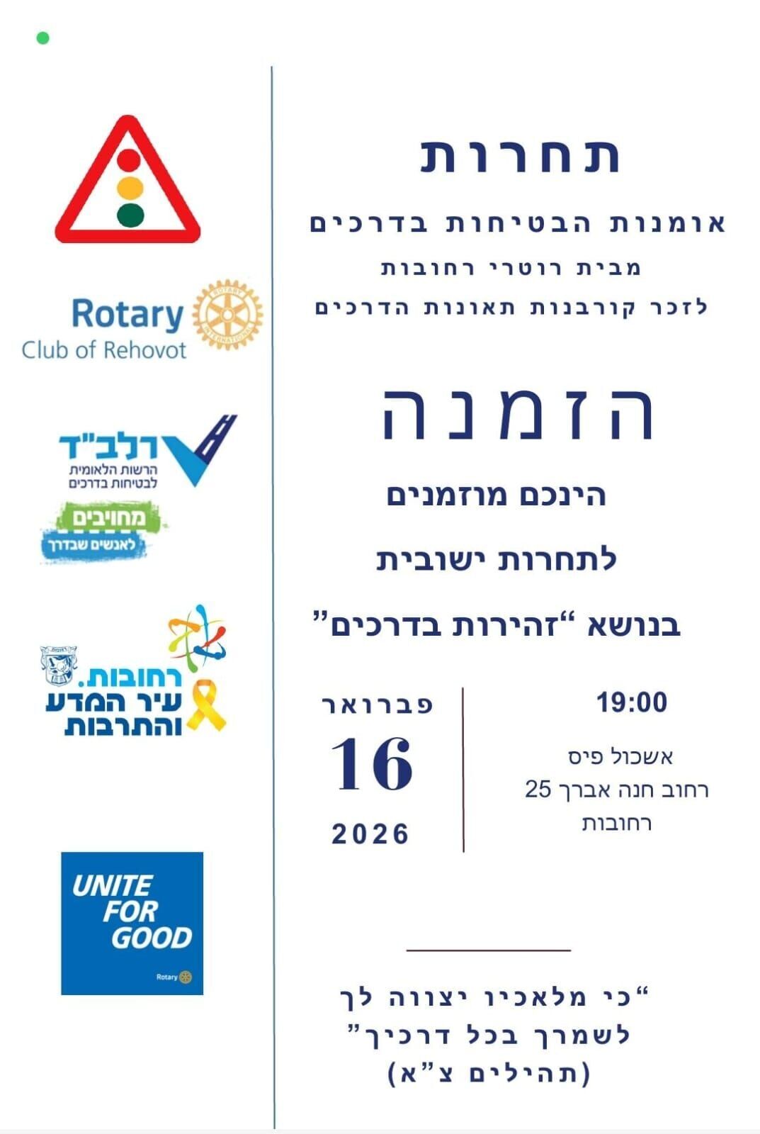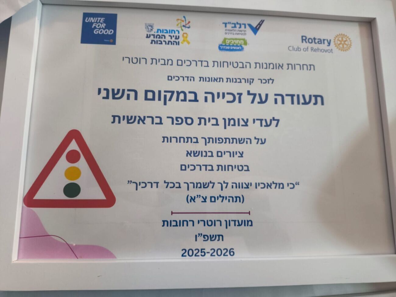 ביום שני האחרון (16.2.26) נערך טקס חגיגי לציון הזוכים בתחרות ציור עירונית בנושא בטיחות בדרכים. האירוע, ביוזמת מועדון רוטרי רחובות ולזכר קורבנות תאונות הדרכים, התקיים באשכול פיס ע"ש חנה אברך ברחובות.