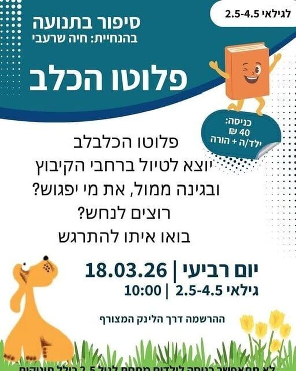 במסגרת הפעילות, המשלבת תנועה, סיפור והנאה לילדים, יוצג הסיפור "פלוטו הכלב". הילדים המשתתפים יצטרפו לפלוטו הכלבלב היוצא לטיול ברחבי הקיבוץ, ויגלו יחד אתו את מי הוא פוגש בדרך במהלך החוויה.