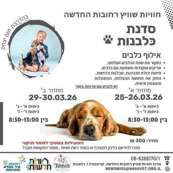 המרכז הקהילתי 'חוויות שוויץ' ברחובות החדשה מזמין הורים לרשום את ילדיהם לסדנת כלבנות ואילוף כלבים חווייתית. הסדנה, שנועדה להעניק לילדים הפוגה בימי המלחמה, פועלת על פי הנחיות פיקוד העורף ומתקיימת בסמוך לממ"ד תקני.