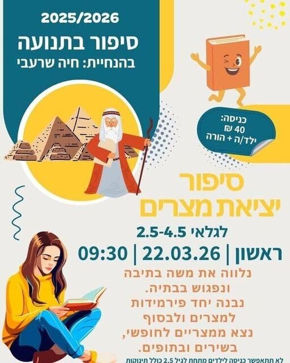 לקראת פסח: פעילות "סיפור יציאת מצרים בתנועה" לילדים במרכז חוויות שוויץ ברחובות (22.03.26)