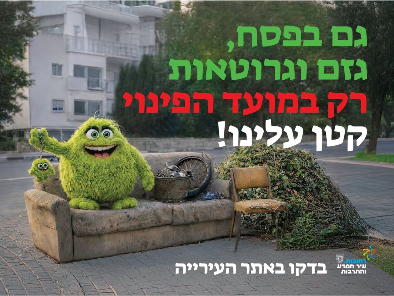 הפינוי יתבצע בהתאם למועדים הקבועים המפורסמים באתר עיריית רחובות. עם זאת, בימי החג, יום חמישי, ט"ו בניסן (2.4), ויום רביעי, כ"א בניסן (8.4), לא יתקיים פינוי גזם וגרוטאות, וחל איסור מוחלט להוציאם בימים אלו. בעירייה שבים ומדגישים כי הוצאה שלא בהתאם להנחיות גורמת לעומסים מיותרים, מפגעים תברואתיים ופגיעה במרחב הציבורי.