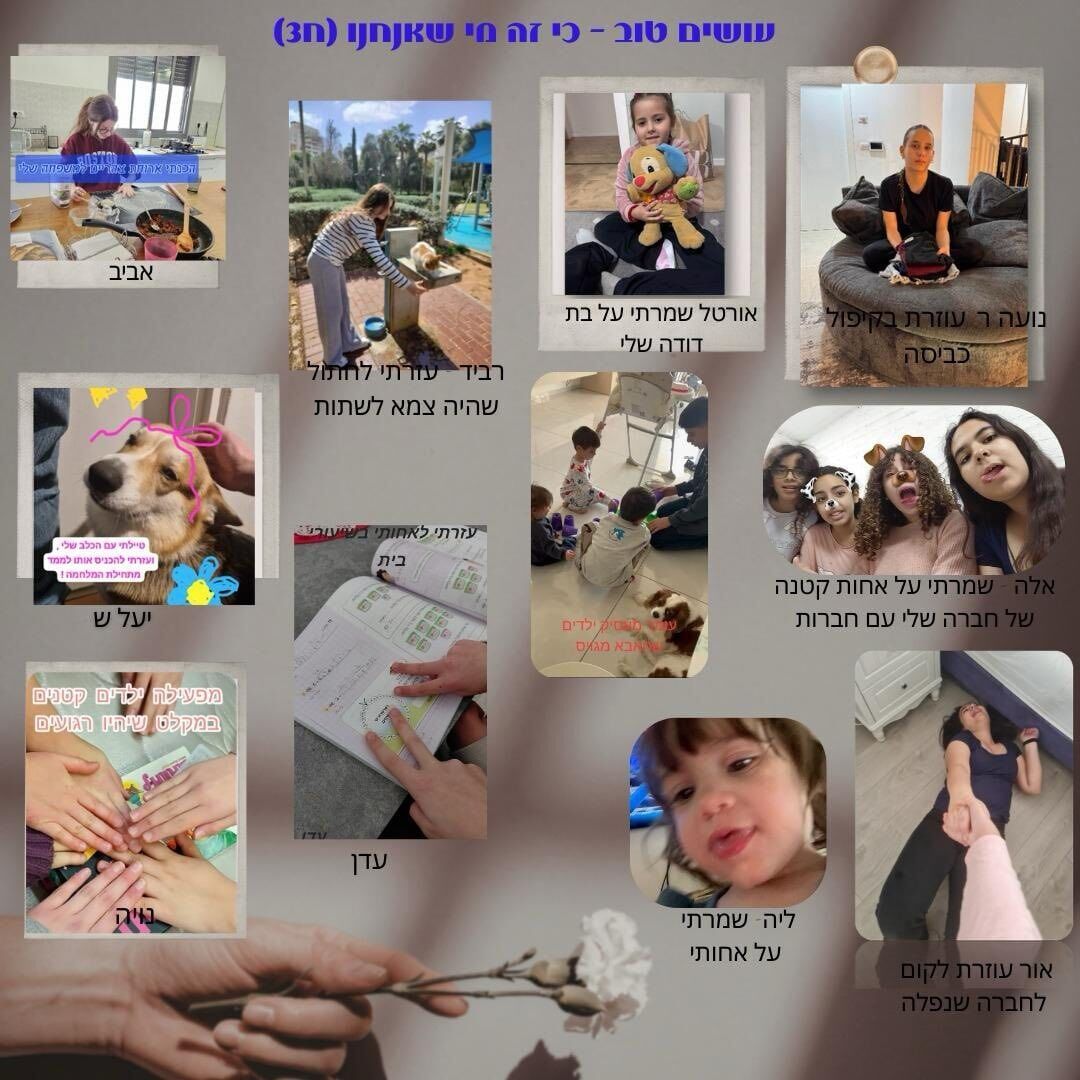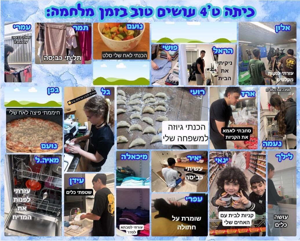 במסגרת המיזם, שבו לקחו חלק בין היתר תלמידי כיתות ז', ח' ו-ט', כל תלמיד בחר לבצע מעשה טוב בסביבתו הקרובה. התיעודים שאספו בבית הספר מציגים רגעים רבים של עשייה חיובית ומגוונת: אפיית עוגיות עבור חיילי צה"ל, סיוע בהפעלת ילדים קטנים במקלטים, הוצאת כלבים לטיול, וכן עזרה יומיומית ומשמעותית בתוך הבתים – כגון שטיפת כלים, ניקיון הבית, קיפול ותליית כביסה, קניות לבית, שמירה על אחים קטנים והכנת ארוחות עבור ההורים.
