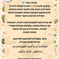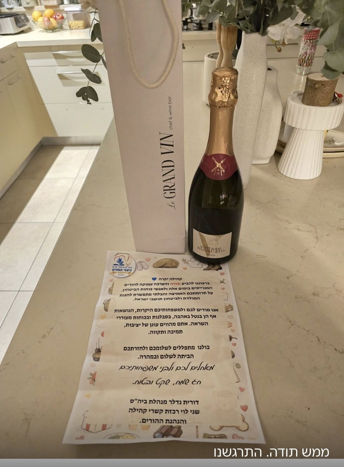 יושבות ראש הנהגת ההורים, מיכל בן דוד ולרה דביר, התגייסו למשימה ויחד עם נציגות נוספות מהנהגת ההורים – שני סוויסה, רעות ניסים, ענת כהן ונועה הלמן – חילקו באופן אישי 70 בקבוקי יין בצירוף ברכה אישית למשפחות, שהתרגשו מאוד מהמחווה.