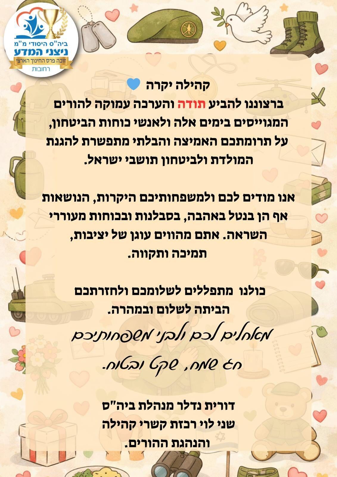 מגורמים בבית הספר נמסר כי הכוח של הקהילה טמון באחדותה, ואיחלו חג פסח כשר, שקט ושמח לכל משפחת "ניצני המדע" ולכל עם ישראל.