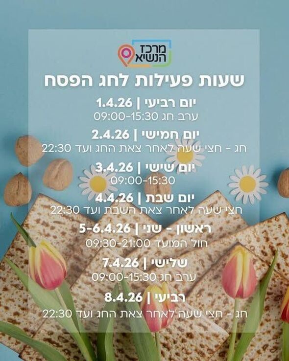- יום שישי (3.4.26): המתחם יפעל בין השעות 09:00 ל-15:30.