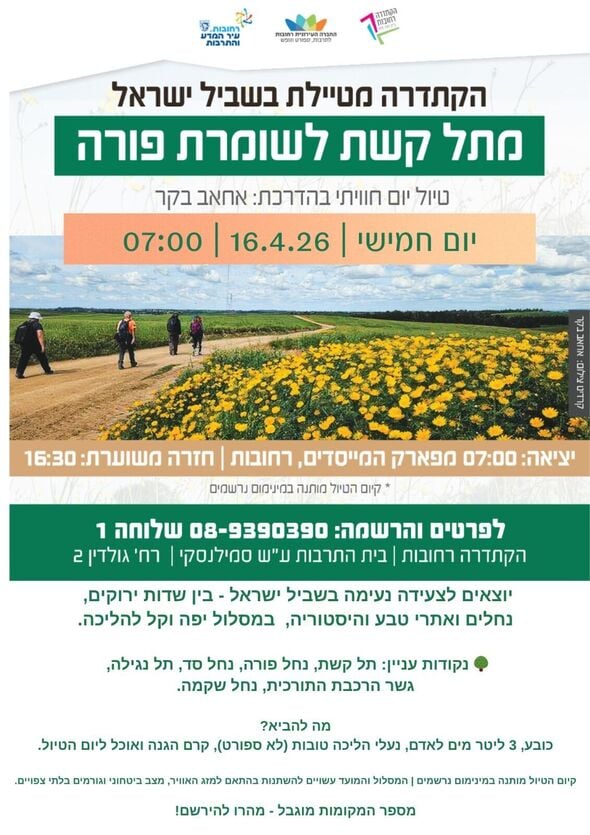 הקתדרה רחובות מארגנת טיול יום מודרך לאורך שביל ישראל, שיתקיים ביום חמישי, 16.4.26. הטיול, בהדרכתו של אחאב בקר, מציע צעידה נעימה במסלול קל להליכה העובר בין שדות ירוקים, נחלים ואתרי טבע והיסטוריה.