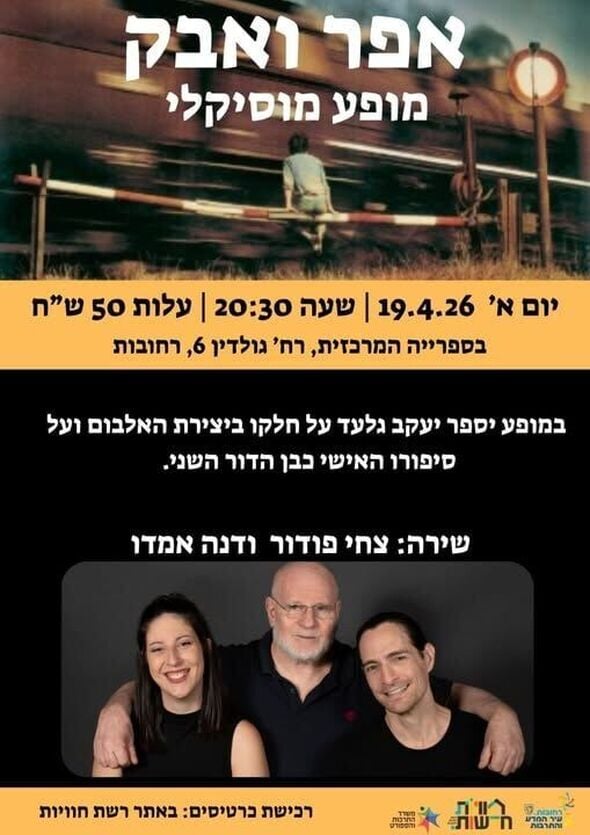רשת חוויות בספריות ברחובות מזמינה את הציבור למופע מוסיקלי מיוחד בשם "אפר ואבק", שיתקיים לציון יום הזיכרון לשואה ולגבורה. האירוע ייערך ביום ראשון, 19 באפריל 2026, בשעה 20:30 בספרייה המרכזית בעיר.