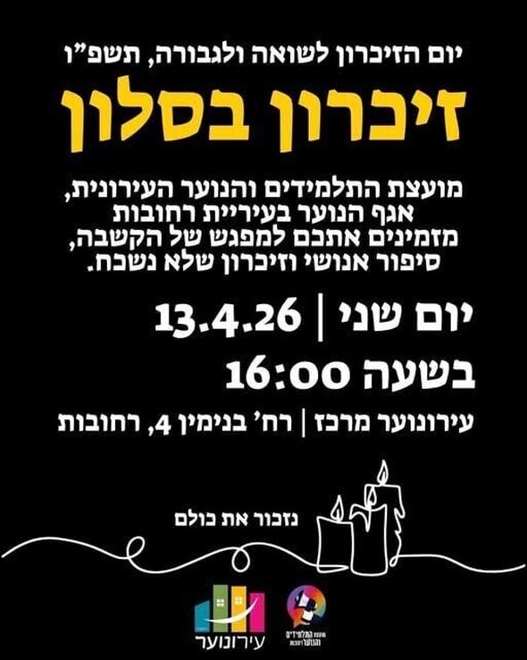 מועצת התלמידים והנוער העירונית יחד עם מרכז "העירונוער" ברחובות יקיימו מפגש "זיכרון בסלון" מיוחד לרגל יום הזיכרון לשואה ולגבורה, תשפ"ו. המפגש נועד לאפשר לבני הנוער ולתושבים לשמוע ולשמר את זכר השואה, ולא לתת לסיפורים להישכח.