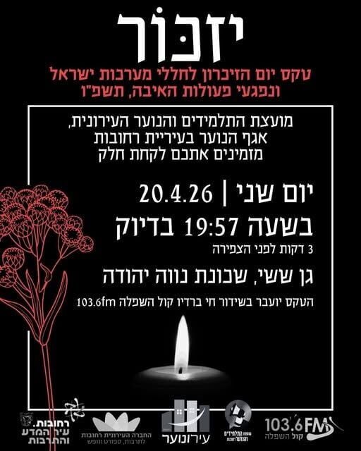 מועצת התלמידים והנוער העירונית, בשיתוף אגף הנוער בעיריית רחובות, יקיימו את טקס יום הזיכרון לחללי מערכות ישראל ונפגעי פעולות האיבה לשנת תשפ״ו.