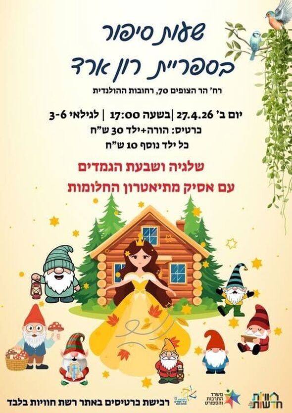 שעת סיפור: "שלגיה ושבעת הגמדים" מגיעה לספריית רון ארד ברחובות ב-27.4.26