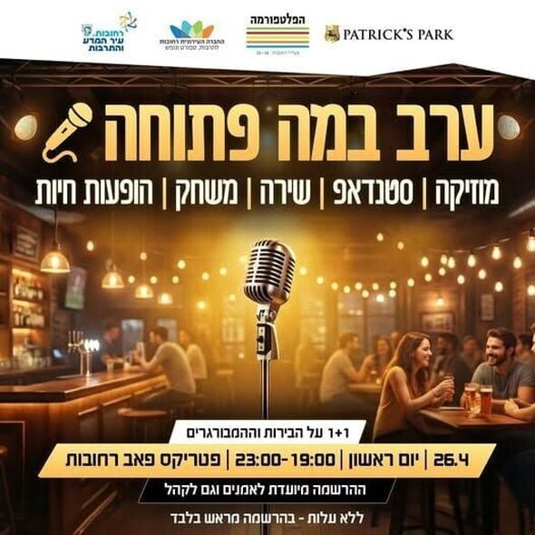 הזדמנות לכישרונות מקומיים: ערב במה פתוחה לצעירות וצעירי רחובות בפטריקס פאב ב-26.4