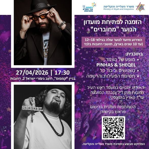 עיריית רחובות משיקה את מועדון "מחוברים" לנוער עולה: המועדון ביוזמת חברת המועצה עו"ד קארין ברגינסקי יפעל בבניין קמפוס ברחוב גיבורי ישראל. אירוע הפתיחה 27/4