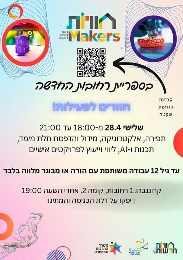 בשורה משמחת לחובבי היצירה והטכנולוגיה ברחובות: מרחב ה"מייקרים" בספריית "רחובות החדשה" חוזר לפעילות. המרחב, המוקדש לשימוש בכלים טכנולוגיים וחדשנות ופועל בליווי מתנדבים, יפתח את שעריו ביום שלישי, ה-28.4.26, בין השעות 18:00 ל-21:00.