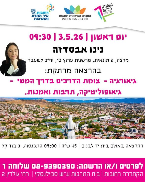 ביום ראשון 3.5.26: הרצאת נינו אבסדזה על גיאורגיה באולם בית יד לבנים ברחובות