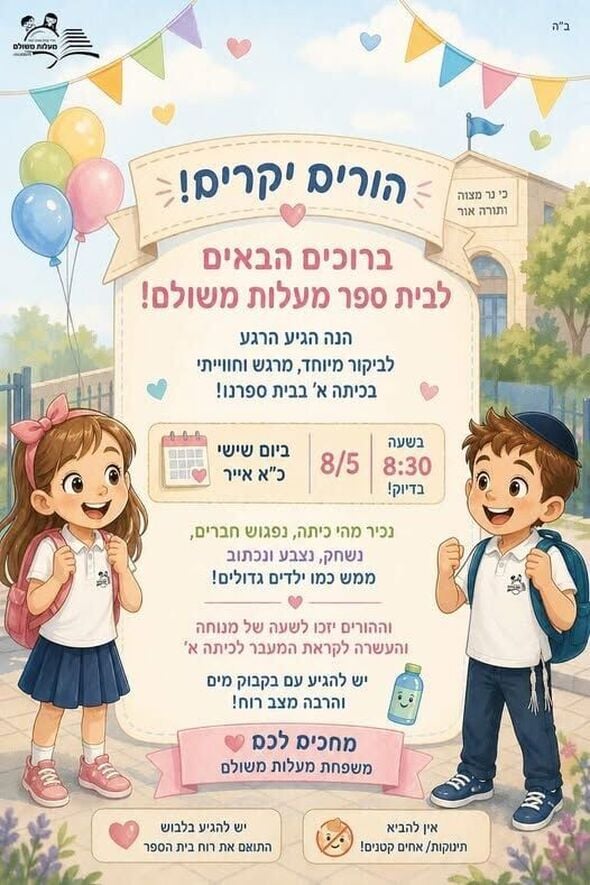 בית הספר "מעלות משולם" ברחובות נערך לקליטת התלמידים החדשים, ומזמין את הילדים העולים לכיתה א' והוריהם לביקור ייחודי וחווייתי במוסד החינוכי. מפגש ההיכרות ייערך ביום שישי, ה-8 במאי (כ"א באייר), בשעה 08:30 בדיוק בשטח בית הספר.