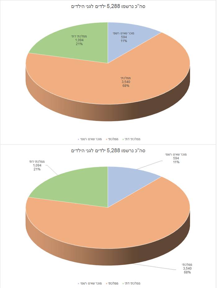 ברישום לגני הילדים ולכיתות א', שנפתח באמצעות האינטרנט העירוני בשבוע שעבר (29.1), נרשמו עד כה, 5288 ילדים המהווים כ- 60% מכלל הילדים הצפויים להירשם לגני הילדים לשנה"ל תשע"ח. מכלל הנרשמים לגני הילדים בשבוע הראשון באמצעות האינטרנט, 68% נרשמו לממלכתי, 21% לממלכתי דתי, 11% למוכר שאינו רשמי. בנוסף, 1917 נרשמו עד כה לכיתות א', המהווים מעל ל- 56% מכלל הילדים הצפויים להירשם לכיתות א' לשנה"ל תשע"ח. מכלל הנרשמים לכיתות א' בשבוע הראשון, 66% נרשמו לממלכתי, 24% לממלכתי דתי ו- 10% למוכר שאינו רשמי.