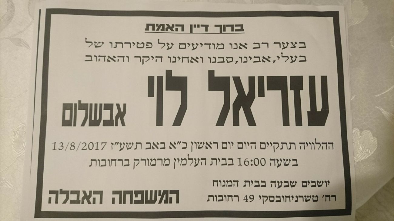ההלוויה היום ראשון 13/8 בשעה 16:00 בבית העלמין מרמורק - שעריים