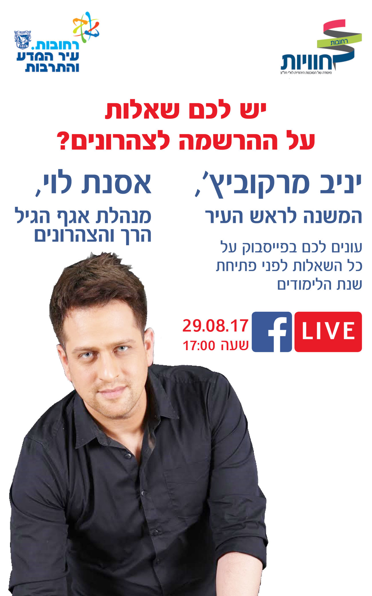 הודעה חשובה להורי ילדי הגנים! ביום שלישי 29/8 החל מהשעה 17:00 יניב מרקוביץ ואסנת לוי יענו בפייסבוק של חוויות על שאלות ההורים בנושא ההרשמה לצהרונים
