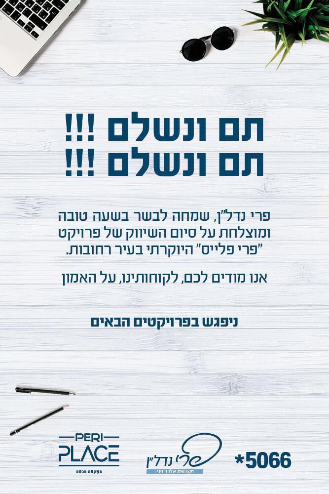 להלן ההודעה של חברת פרי נדל"ן על סיום שיווק הפרויקט