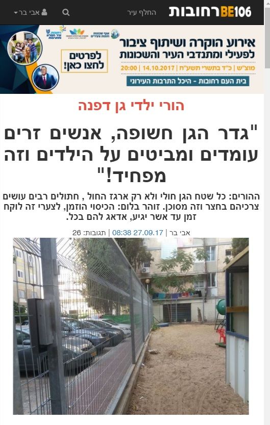 בתחילת השבוע פנו הורים מגן דפנה אל מערכת be106 ובפיהם טענה, כי בניגוד לרוב הגנים, בגן דפנה אין כיסוי לגדרות הגן ולא פעם נמסר להם על אנשים זרים הנעמדים ליד הגן ומביטים על הילדים וזה מפחיד אותם נורא.
