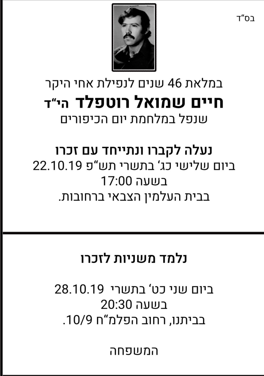 מוקירי זכרו מוזמנים לבית העלמין וביום שני 28/10/19 לימוד משניות לזכרו ברחוב הפלמ"ח