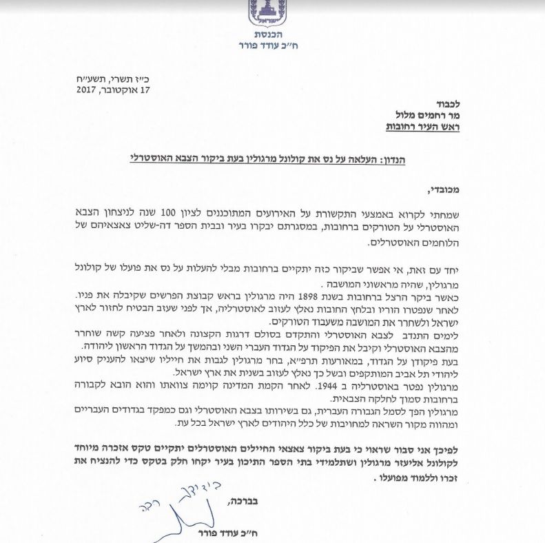 ח"כ עודד פורר פנה לרחמים מלול לקיים בזמן הביקור ברחובות של צאצאי הפרשים האוסטרלים שניצחו את הטורקים בקרב על רחובות לקיים בתיכון דה שליט טקס אזכרה גם לקולונול מרגולין אשר נקבר על פי צוואתו ברחובות