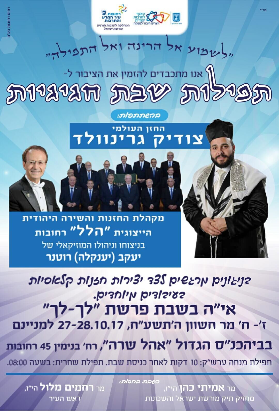 היום שישי ומחר שבת "תפילות שבת חגיגיות" עם החזן העולמי צודיק גרינוולד ומקהלת החזנות "הלל" בבית הכנסת "אוהל שרה"