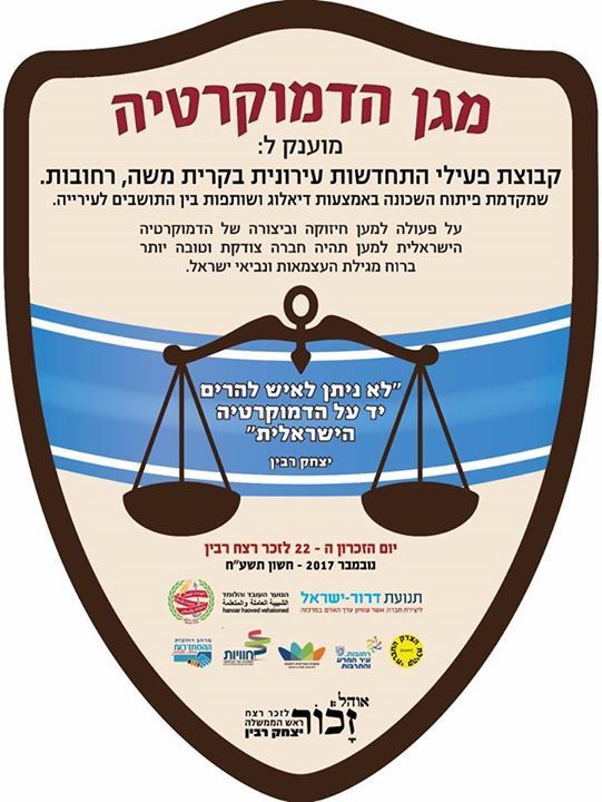 קהילת הצדק החברתי ברחובות החליטה להזמין את נציגי הפעילים להתחדשות עירונית בקרית משה לקבלת אות מגן הדמוקרטיה.
