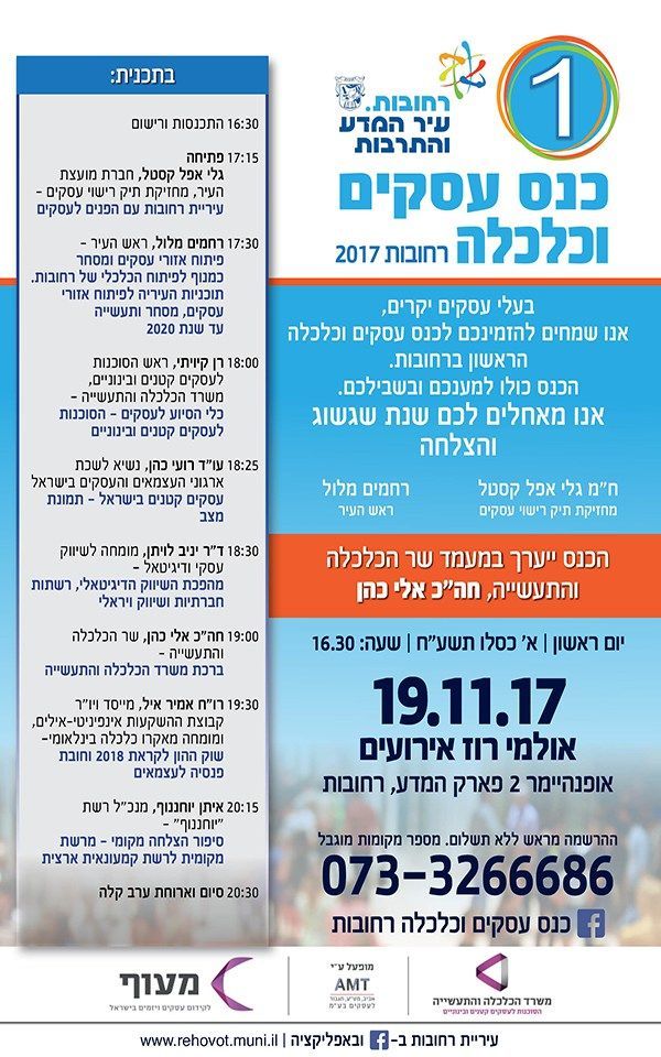עיריית רחובות, בשיתוף מעוף לעסקים קטנים ובינוניים במשרד הכלכלה ובהובלת חברת המועצה גלי אפל, עורכת כנס עסקים וכלכלה בעיר רחובות. הכנס יתקיים במעמד ראש העיר, ושר הכלכלה והתעשיה והוא מיועד לבעלי עסקים מרחובות והסביבה