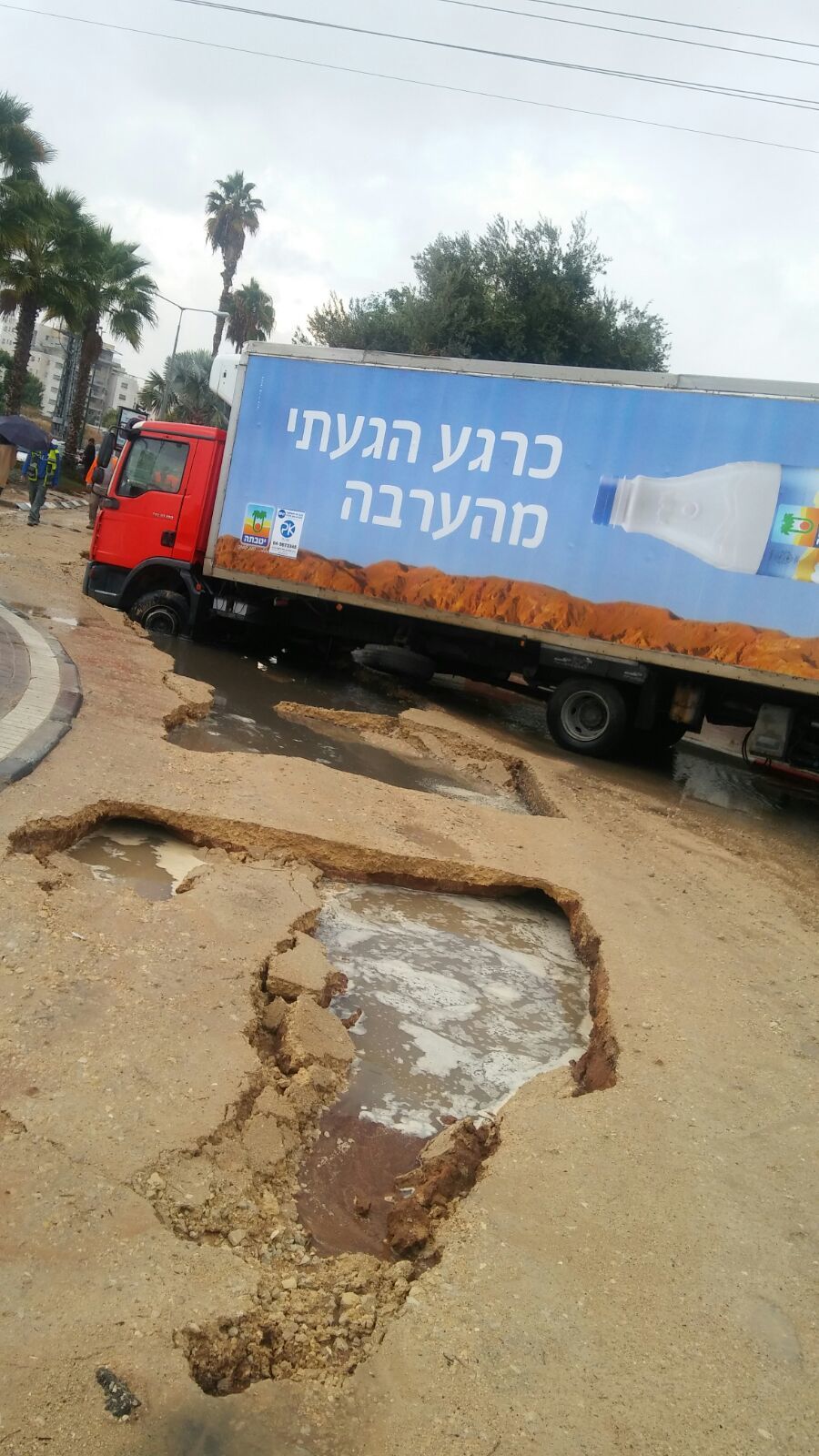 מבזק תנועה: משאית נפלה לתוך בור בכביש באזור התעשייה