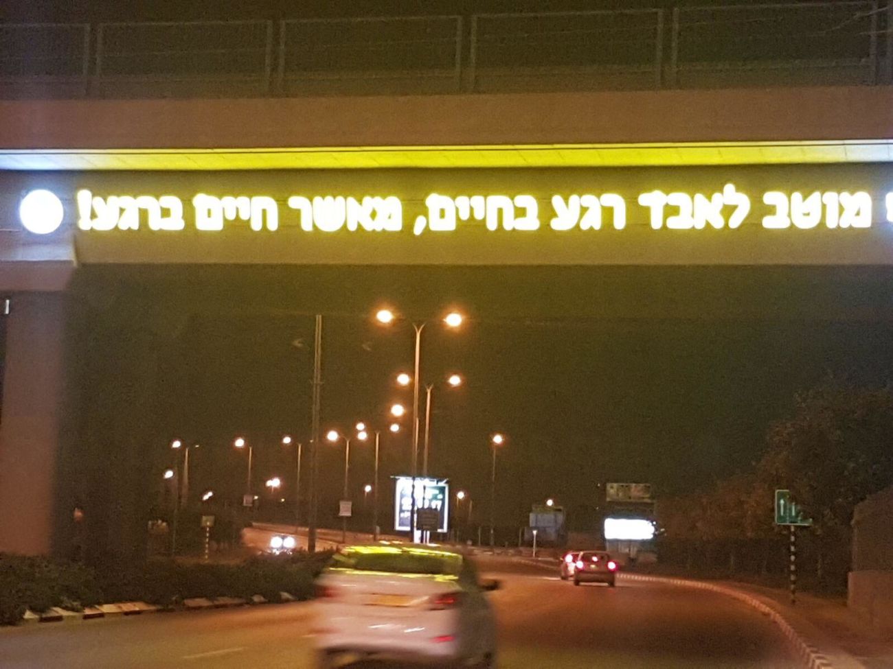 רחמים מלול : השלט " מוטב לאבד רגע בחיים מאשר חיים ברגע" מזכיר לנהגים הבאים בשערי העיר לשמור על החיים, ולהילחם בתאונות הדרכים