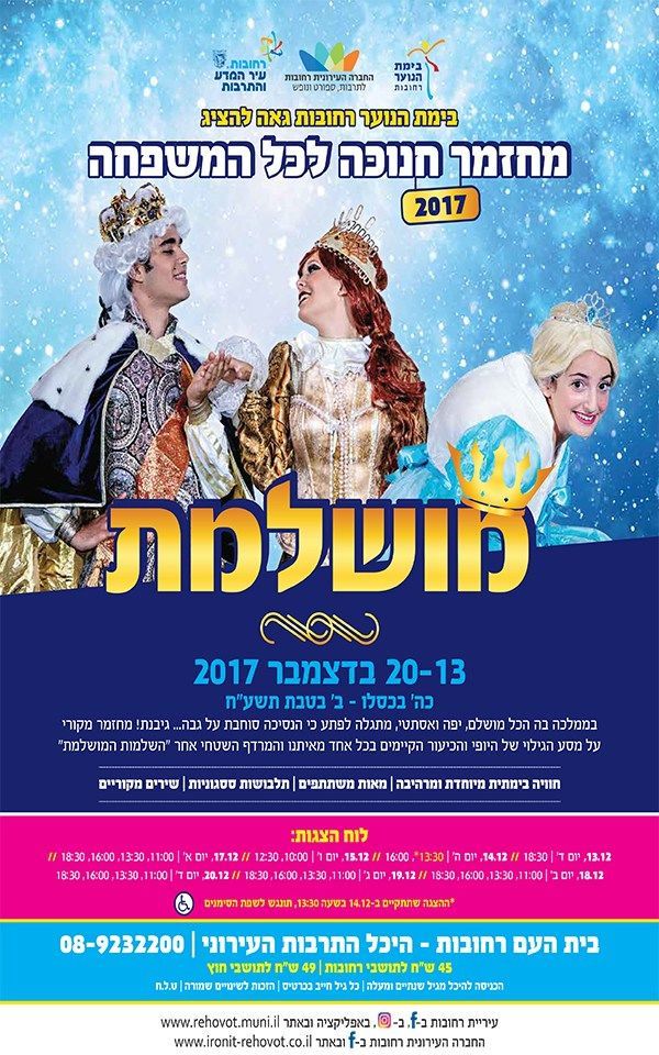 ביום שלישי 19/12 שעות ההצגה 11:00, 16:00, 18:30 וביום רביעי 20/12 בשעות 11:00, 13:30, 16:00, 18:30 להזמנת כרטיסים 08-9232200