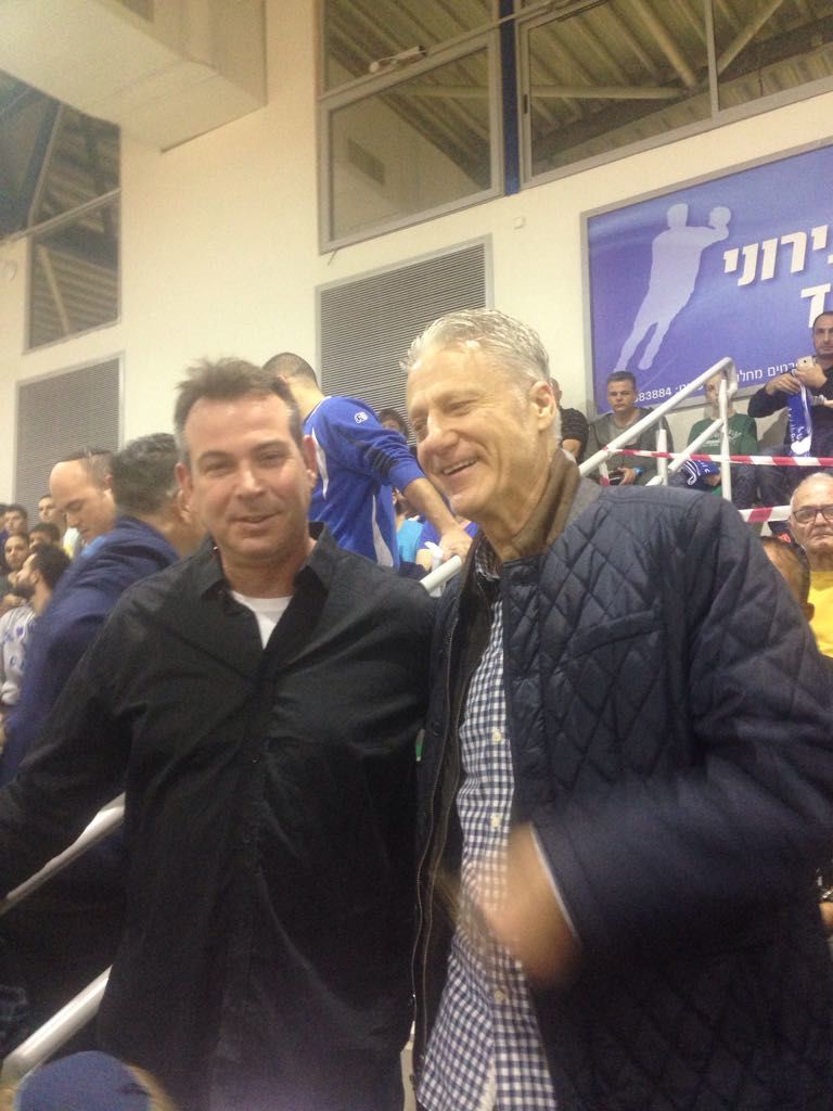 וביציע נראה אורח מכובד כוכב הכדורסל מיקי ברקוביץ עם אבי קינד
