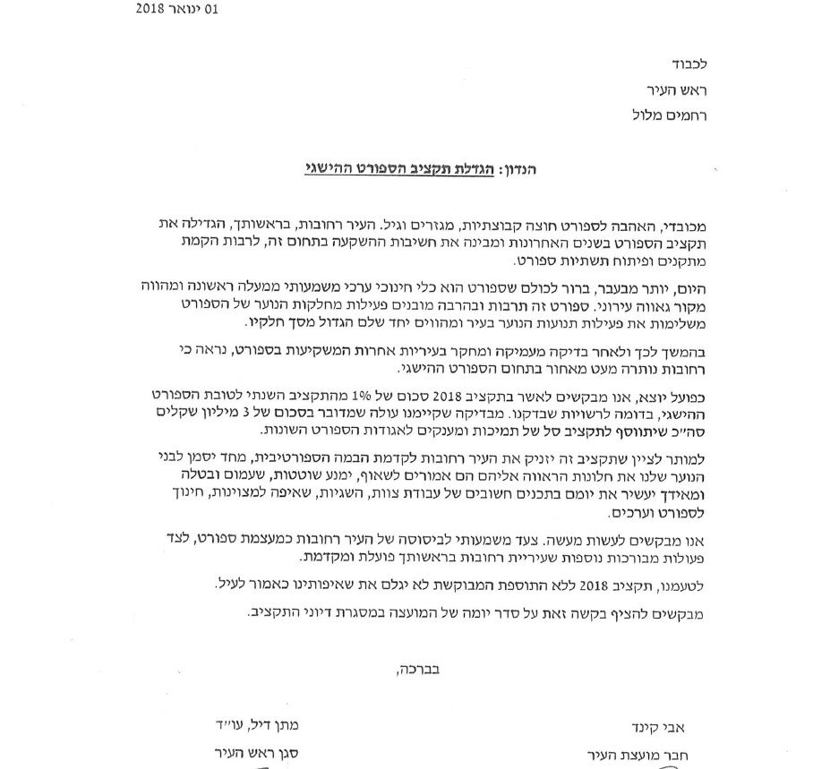 לקראת הישיבה שלחו סגן ראש העיר מתן דיל וחבר המועצה אבי קינד הידועים כמעורבים מאוד בכל הקשור לספורט ברחובות, מכתב משותף לראש העיר רחמים מלול ובו בקשה להגדיל באופן משמעותי את התקציב לקבוצות הספורט ההישגי ברחובות ולהעמיד אותו כמו לטענתם בעיריות אחרות על 1% מהתקציב.