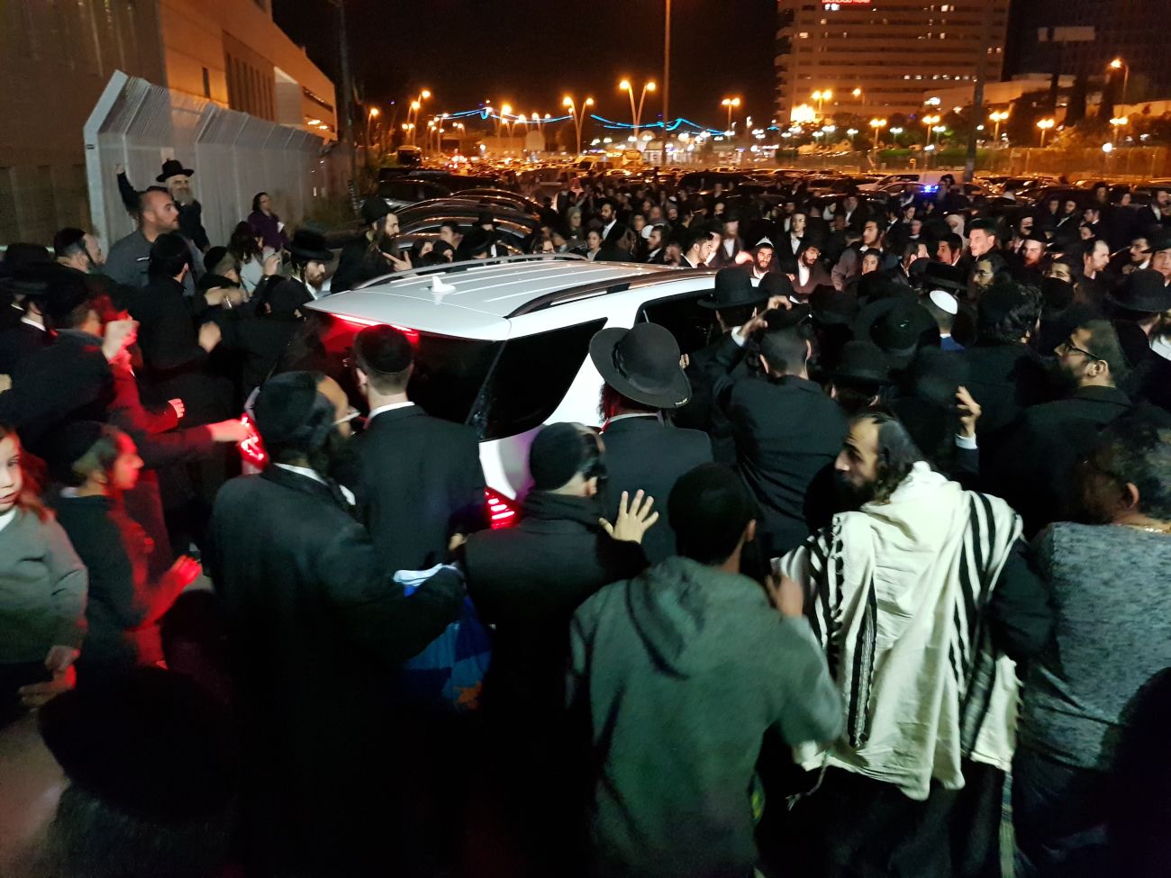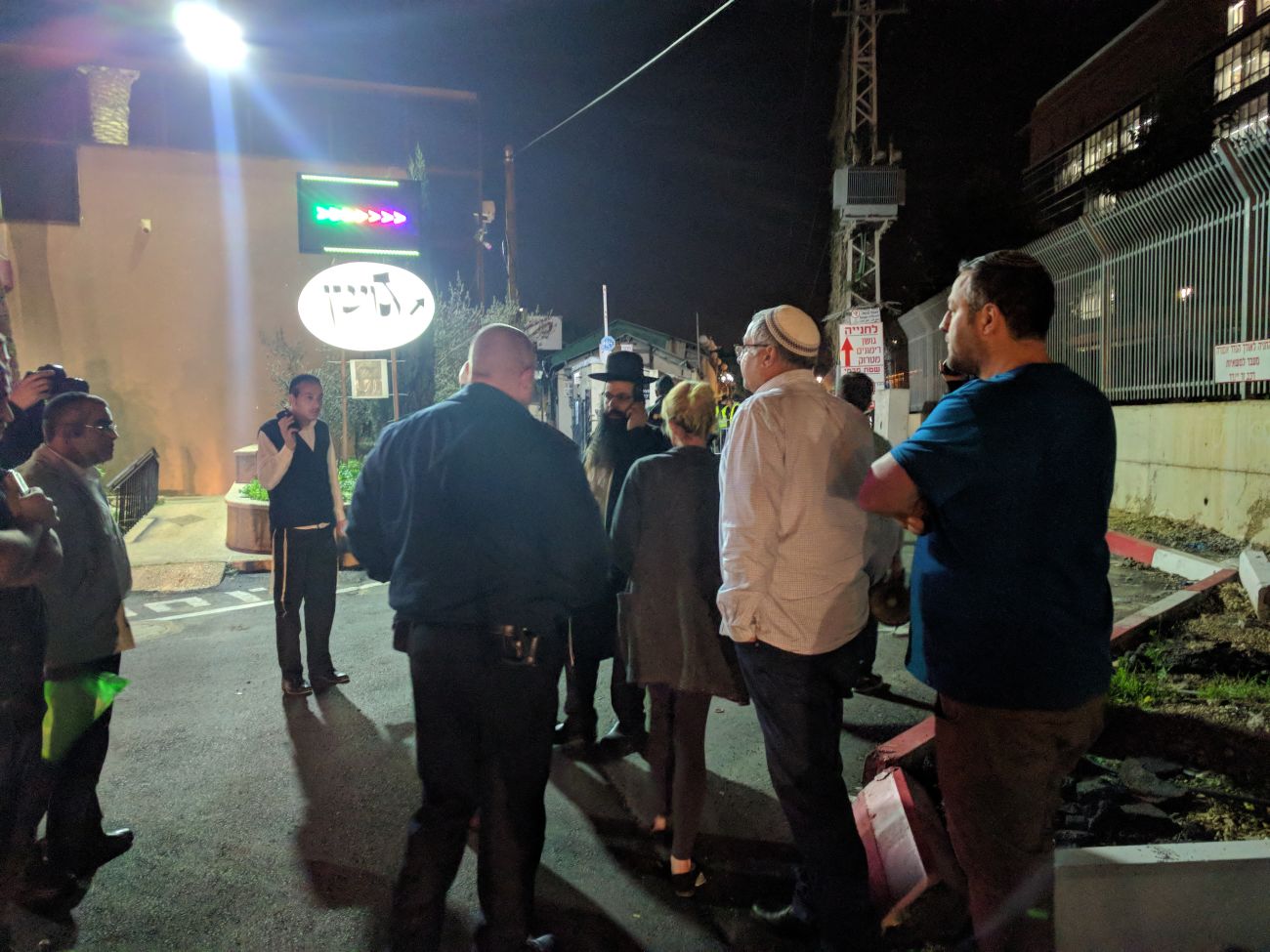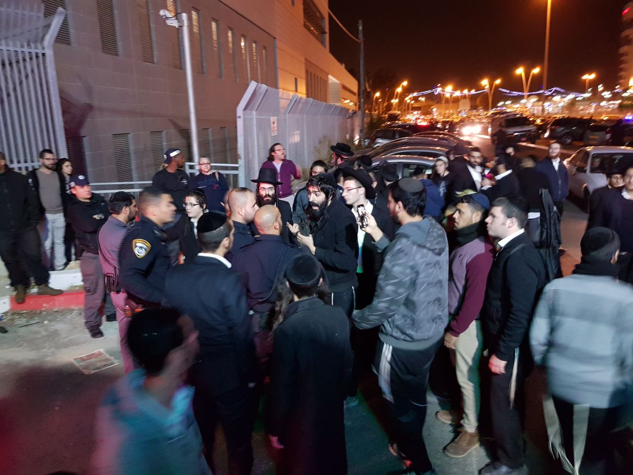 אכן בשעה 19:30 הם פרסמו כי הכנס יתקיים באולמי גושן ליד הרכבת ולמקום החל לזרום נהר של אדם ולהערכה 1500 – 2000 חסידים אולם גם מתנגדי הרב הגיעו למקום ובהם חברת המועצה יעל בק אך מי שהפתיעו הייתה קבוצת חרדים מירושלים אשר הגיעו עם שלטי מחאה נגד הרב ובינם לבין החסידים פרצו מידי פעם עימותים אך השוטרים שהיו במקום השתלטו במהירות על האירועים כדי שלא ייצאו מכלל שליטה.