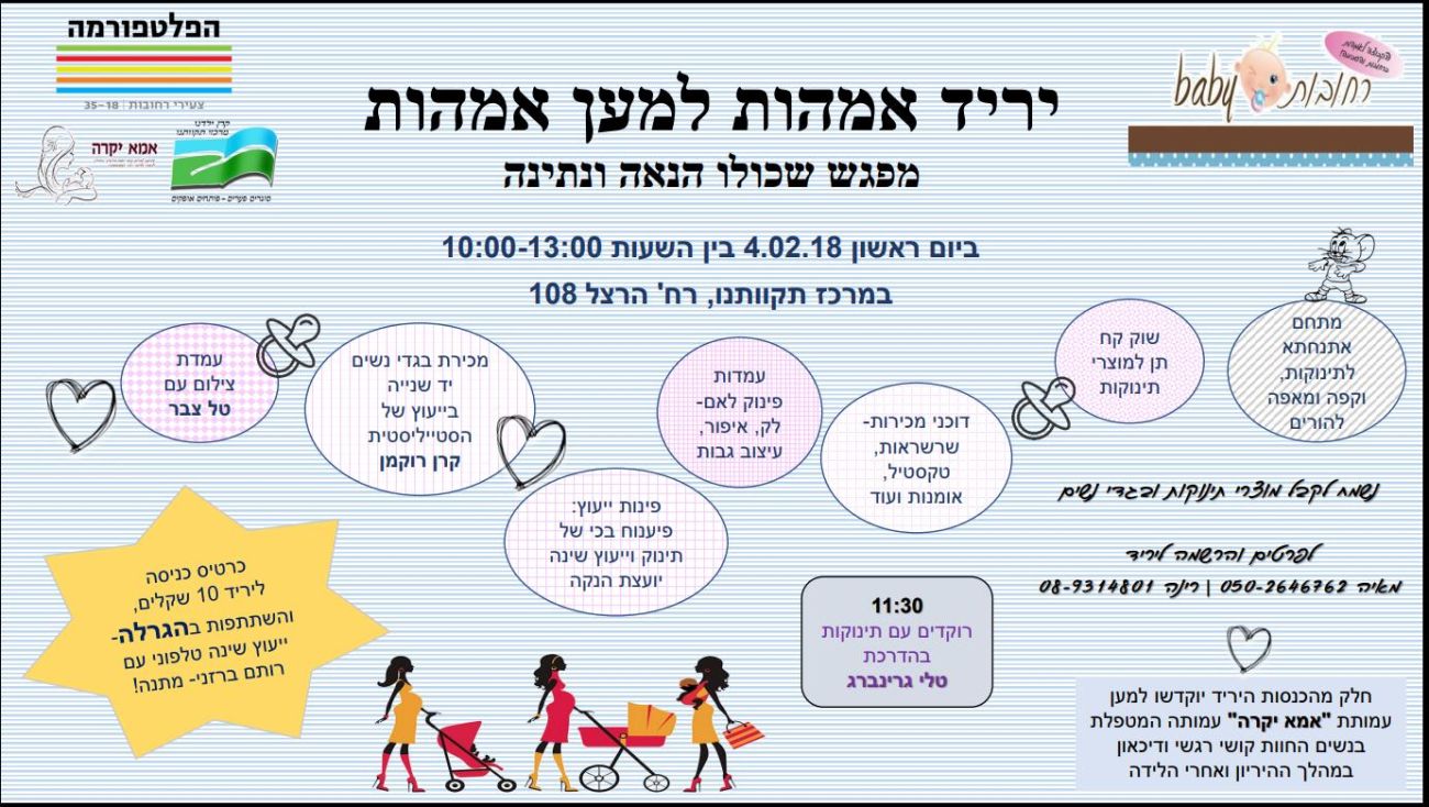 יריד מיוחד לאמהות יתקיים ביום ראשון 4/2 במרכז תקוותנו ברחובות כולל שוק קח תן למוצרי תינוקות