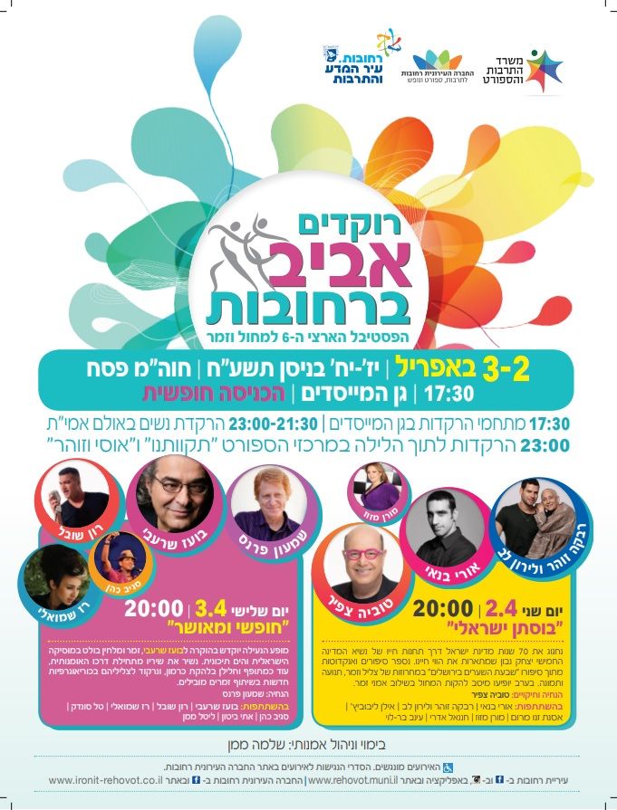 תזכורת הערב שלישי בגן המייסדים פסטיבל "רוקדים אביב ברחובות" עם: בועז שרעבי, שמעון פרנס, רון שובל, סגיב כהן ורז שמואלי