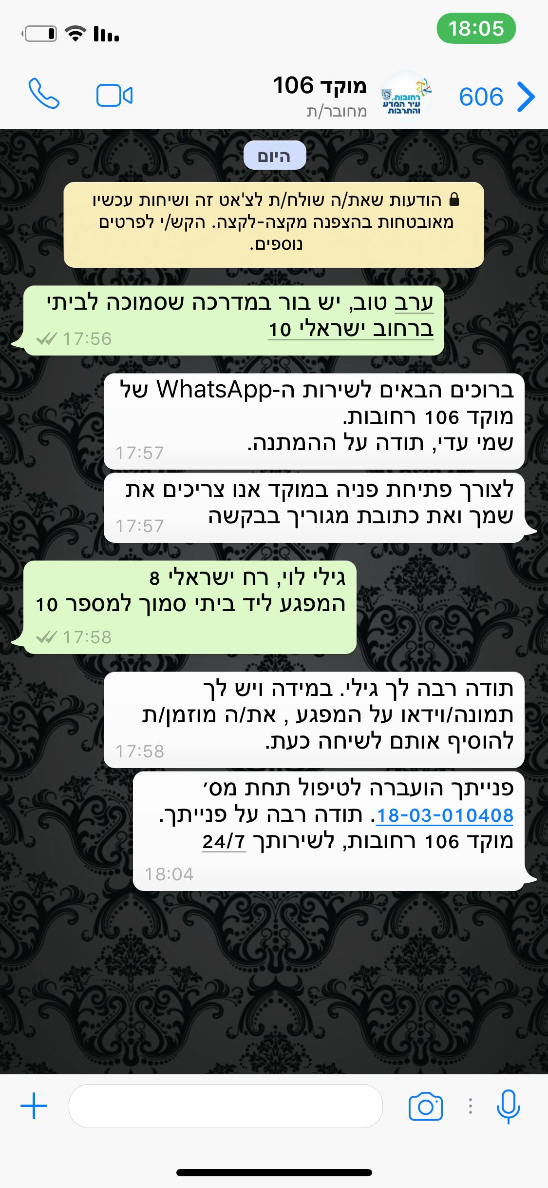 ראיתם מכונית שחונה בחניית נכים? יש מפגע על המדרכה שדורש תיקון? השכנים משתמשים בקריוקי רועש במיוחד? ראיתם אדם חשוד? מעכשיו המוקד העירוני עוד יותר זמין לשירותכם - באמצעות WhatsApp, במספר 050-8806106 מלבד הודעות, ניתן יהיה לשלוח לשם תמונות וסרטונים