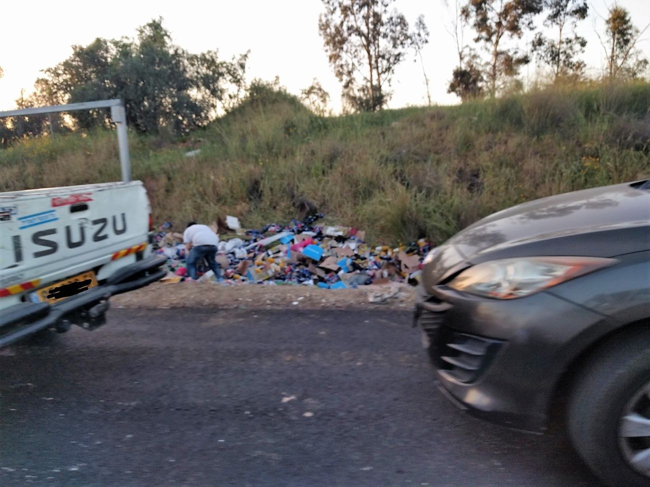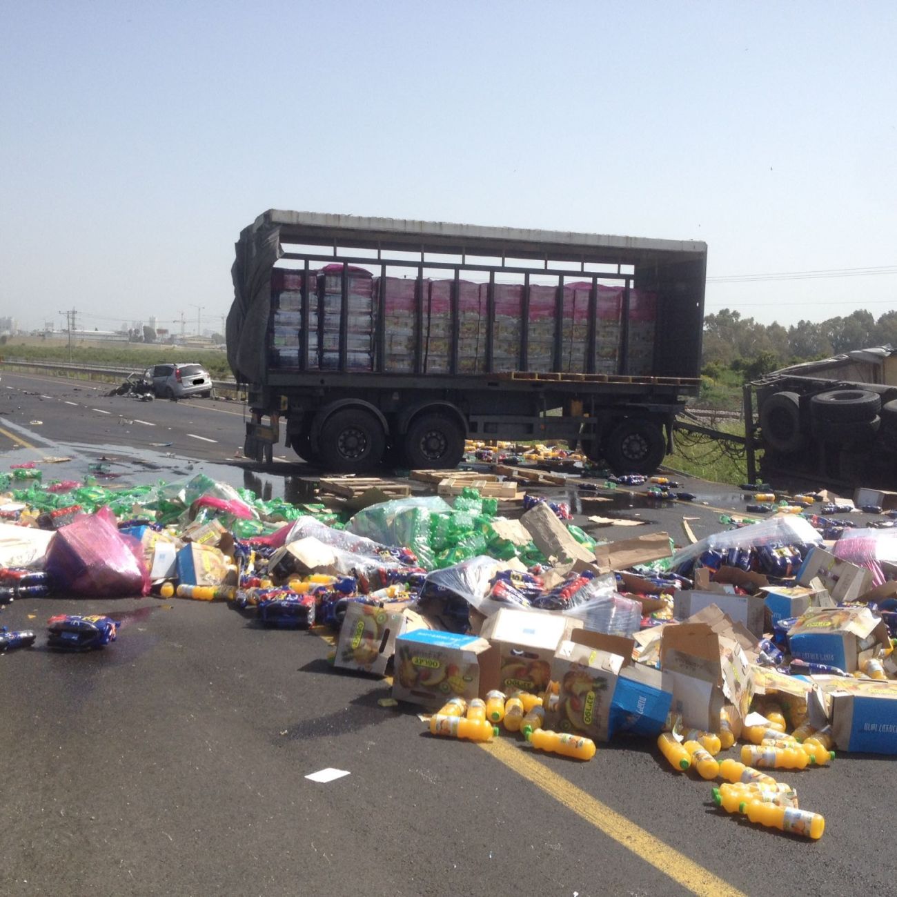 מבזק וואטסאפ אדום: לחצי תנועה כבדים בגלל אנשים שאוספים משקאות שנפלו בבוקר מהמשאית שהתהפכה ליד גשר כפר גבירול