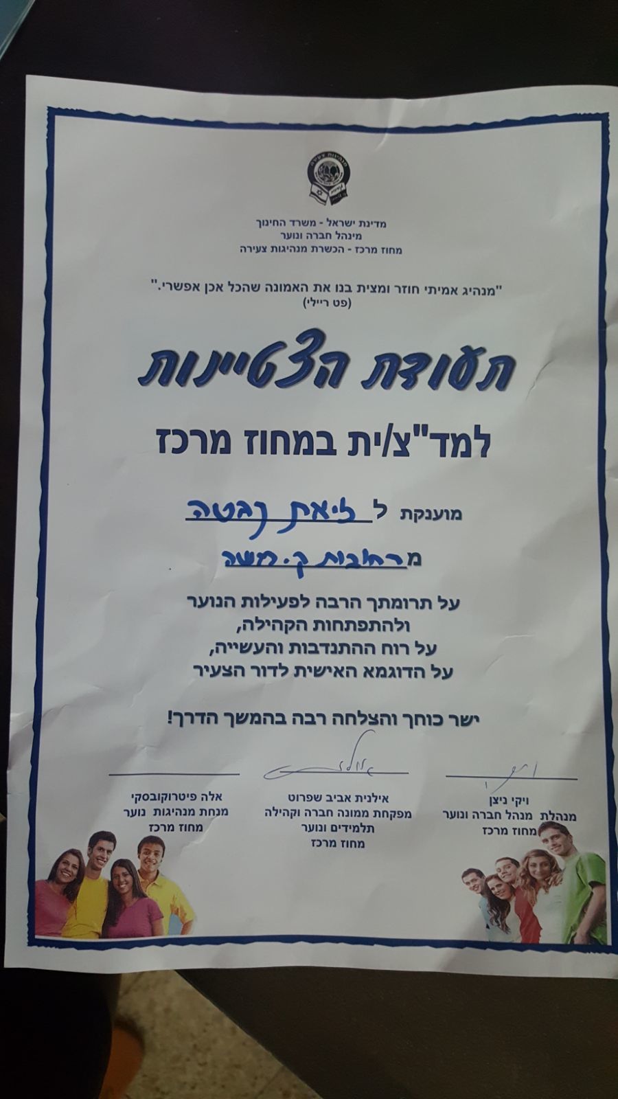 בכנס מד"צים (מדריכים צעירים) שנערך על ידי החברה למינהל ונוער במחוז מרכז של משרד החינוך הוענקו תעודות הצטיינות ליאת נגטה מחוויות קרית משה ותהילה דבוש מחוויות גבירול.