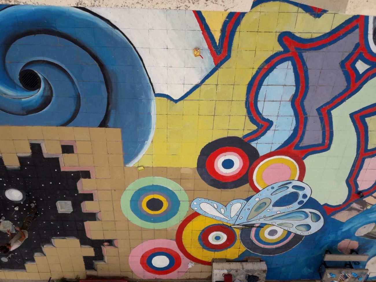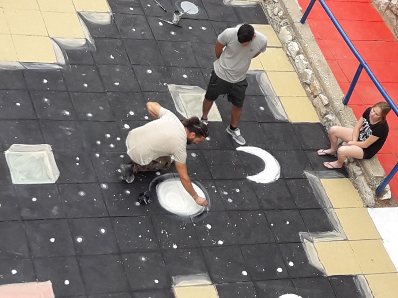 הציור שגודלו קרוב 500 מ"ר בוצע על הרצפה תוך שימוש בצבעי כבישים על מנת להבטיח את עמידות הציור.