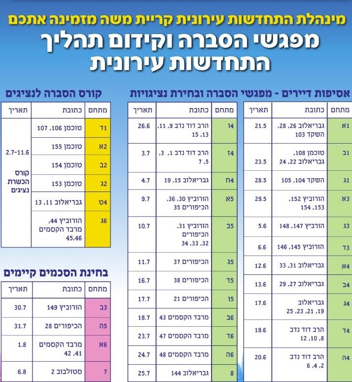לפני כחודשיים הוקמה מנהלת ההתחדשות העירונית בקריית משה על ידי עיריית רחובות ומשרד הבינוי והשיכון וכעת היא יוצאת לדרך. במהלך חודשים מאי – אוגוסט תקיים המנהלת מפגשי הסברה לתושבים הגרים ב33 מתחמי פרוייקט פינוי בינוי העומד להתבצע בשכונה.