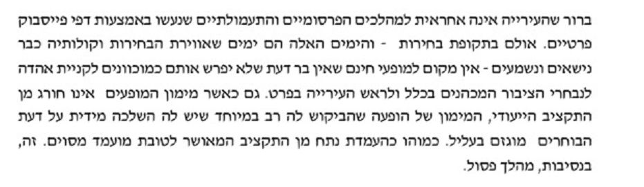 הפסיקה של השופט הייתה מעניינת והוא פסק כי הופעה של זמר מושך קהל במיוחד אסורה במימון מלא של העירייה בתקופת הקיץ והסתיו לפני הבחירות.