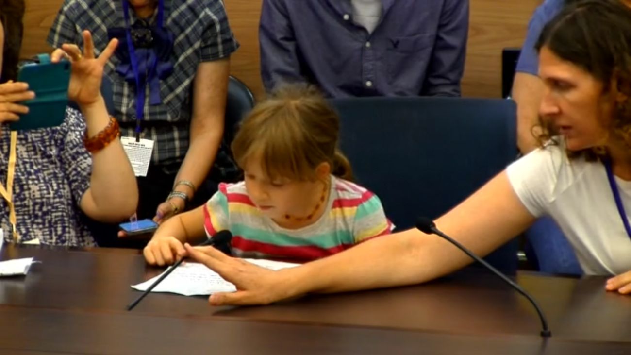 ענבר גופר תלמידת כיתה ב' בבית הספר שפרינצק זומנה לדיון בכנסת כדי לנסות לשכנע את חברי הכנסת לבטל את סגירת הטלוויזיה החינוכית