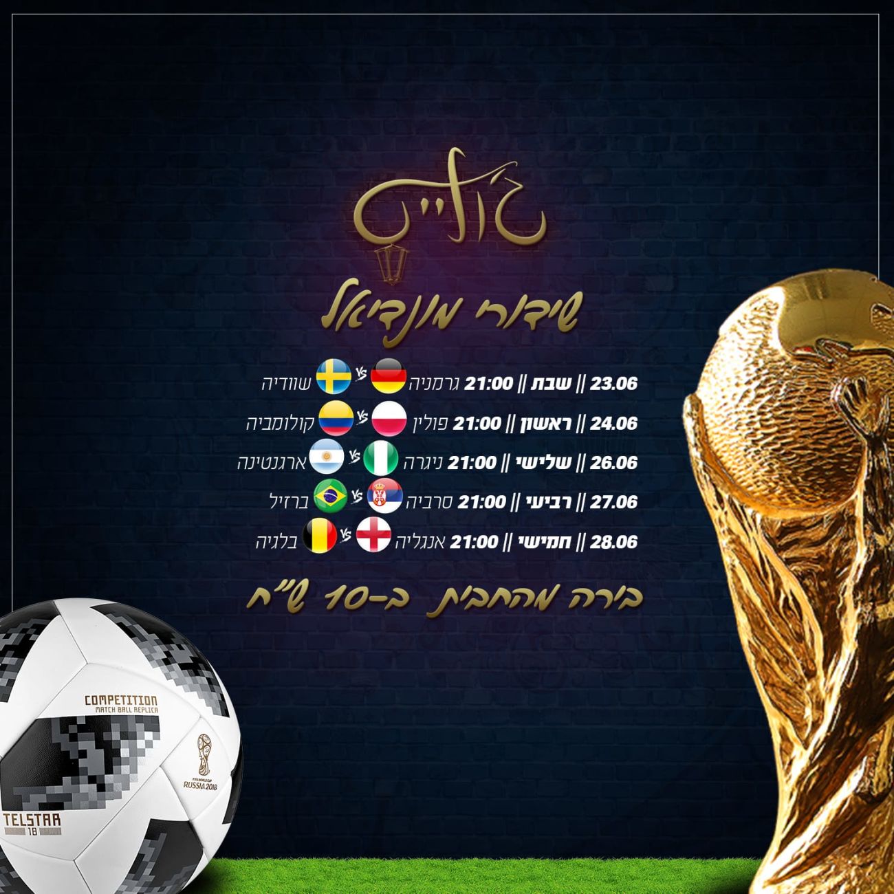 בבר ה'בלקינד' דואגים לאווירת המונדיאל וכותבים: "ברזיל, גרמניה, צרפת...יש רק נבחרת 1 שבאמת מוכנה למונדיאל: נבחרת הבלקינד!! אז בואו לצפות עם הנבחרת שבאמת עושה מהמונדיאל חגיגה של כדורגל".