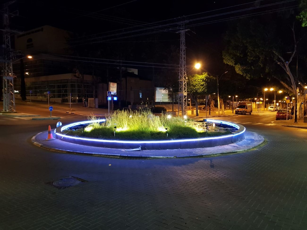 בעיגול הכיכר הותקנו מנורות לד חסכוניות מחליפות צבעים שמביאות למראה מרהיב
