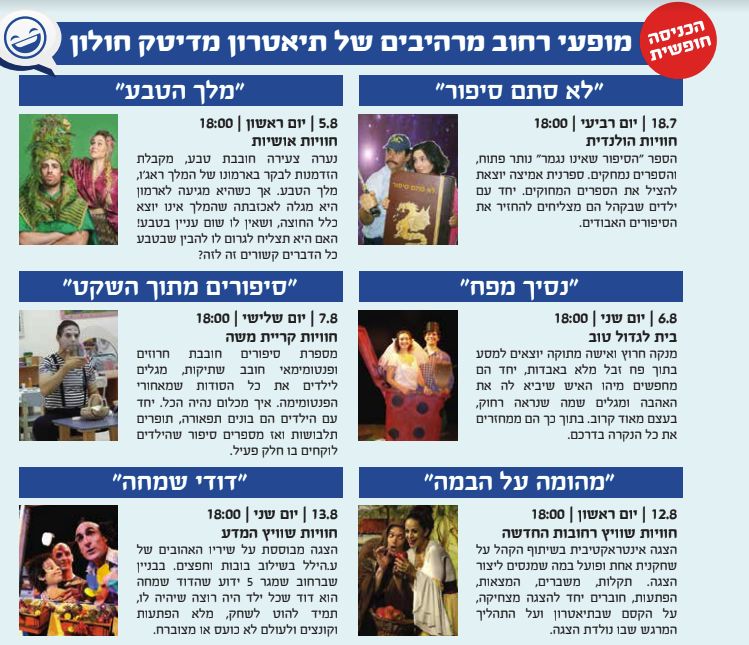 לראשונה הקיץ תפעיל רשת חוויות רחובות מערך אירועים המיועדים לילדים, בכניסה חופשית או בעלות סימלית בסך 10 שקל. התוכנית כוללת מופעי רחוב מדהימים בשיתוף "מדיטק" חולון, שעות סיפור ויצירה, הפנינג משפחות והכל בתוך המרכזים הקהילתיים וקרוב לבית.