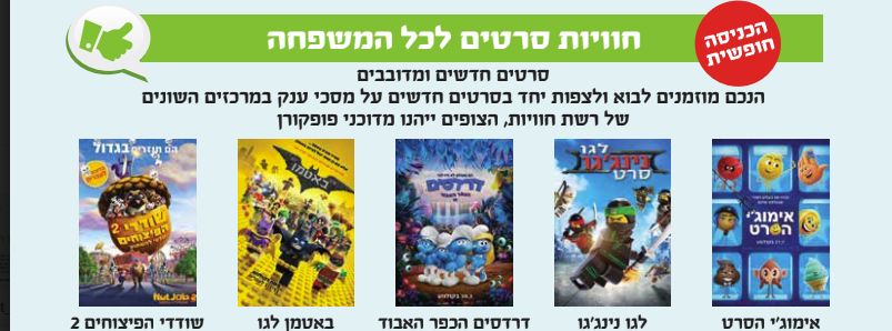 הקרנת סרטים ברחבות מרכזי רשת חוויות המיועדות לילדים שייהנו מדוכני פופקורן