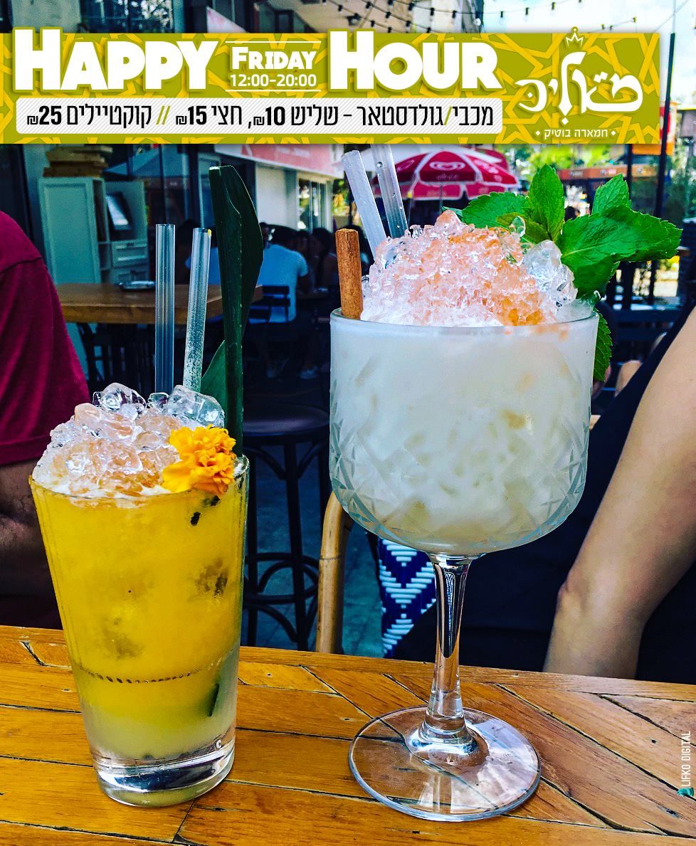 "מסיבת הקוקטיילים" של ימי שישי בצהריים בחצר ה'מאליכ' ממשיכה וגדלה משבוע לשבוע וה'מאליכ' מציג בפנינו שתי קוקטיילים שכיכבו שם בשישי שעבר: 'מאליכּאקספרס' משמאל, ו'מאליקוקוס' מימין (מצ"ב תמונה למטה). במסיבת הזאת כל הקוקטיילים נמכרים ב-25 ₪ ובירות מכבי/גולדסטאר ל-10 ₪ לשליש, 15 ₪ לחצי ליטר.